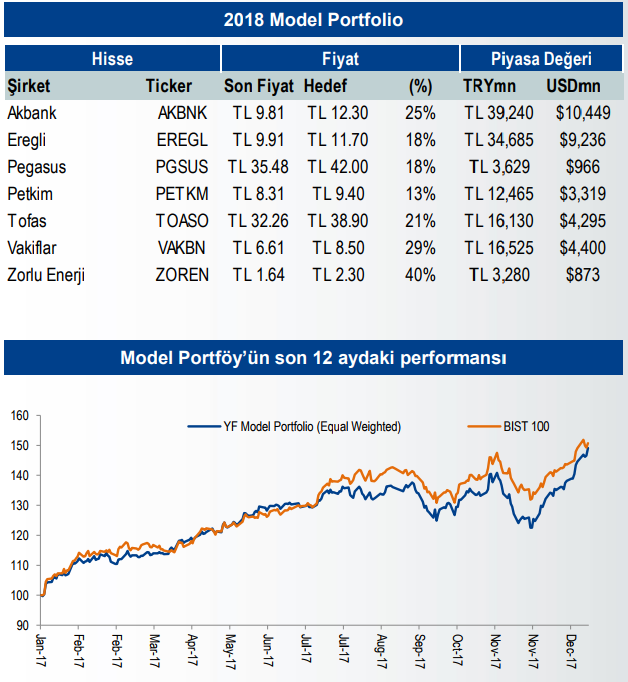 YF Model Portföy hisseleri: PGSUS, AKBNK, VAKBN, PETKM, EREGL, TOASO, ZOREN Bu raporla Turkcell, Aksa Enerji, Yapı Kredi Bank, Kardemir ve Garanti’yi model portföyümüzden çıkarırken Akbank, Erdemir, Pegasus, Petkim, ve Vakıfbank’ı ise listeye ekliyoruz. Şu anda Model Portföyümüz Akbank, Erdemir, Petkim, Pegasus, Tofas, Vakıfbank ve Zorlu Enerji’den oluşmaktadır: Akbank (Endeks Üzeri Performans tavsiyesine yükseltiyoruz. Güçlü bilanço yapısı ve cazip değerleme nedeni ile tercih ediyoruz); Erdemir (Güçlü 4Ç sonuçları ve yüksek temettü verimi ile öne çıkıyor); Pegasus (Piyasanın kar beklentileri hala çok düşük); Petkim (Artan entegrasyon ile güçlenen operasyon); Tofas (İhracatta iyileşme hisseyi yukarı çekecektir); Vakıfbank (%16 seviyesindeki özkaynak karlılığına karşılık cazip değerlemesi); Zorlu Enerji (Yenilenebilir enerjiye yapılan yatırımların dönüşü).