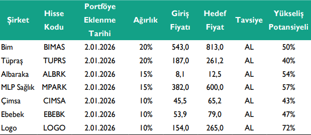 2026 yılına girerken yeniden dizayn ettiğimiz Kuveyt Türk Yatırım Katılım Odaklı Model Portföyümüz, Bim Birleşik Mağazalar (BIMAS), Tüpraş (TUPRS), Albaraka (ALBRK), MLP Sağlık Hizmetleri (MPARK), Çimsa (CIMSA), Ebebek Mağazacılık (EBEBK) ve Logo Yazılım (LOGO) hisselerinden oluşmaktadır. Model portföyümüzde; Bim ve Tüpraş’ı %20, Albaraka ve MLP Sağlık Hizmetleri’ni %15, Çimsa, Ebebek ve Logo Yazılım’ı ise %10 ağırlıkla takip edeceğimizi belirtmek isteriz. 2026 yılı için oluşturduğumuz yeni model portföy; sektörleri içerisinde ağırlığı yüksek, iskontolu fiyatlandığını düşündüğümüz ve güçlü büyüme potansiyeline sahip şirketler dikkate alınarak hazırlanmıştır.