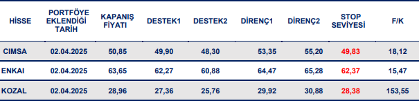 Kısa vadeli öneri listemize CIMSA, ENKAI ve KOZAL pay senetlerini dahil ediyoruz.
