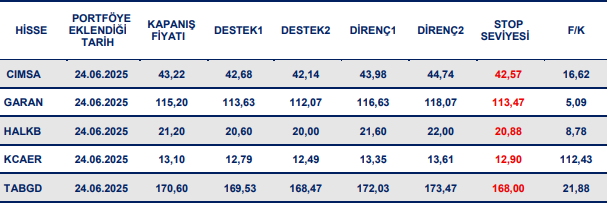 Kısa vadeli öneri listemize CIMSA, GARAN, HALKB, KCAER ve TABGD pay senetlerini dahil ediyoruz.