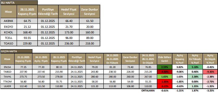 Hafta içerisinde ENJSA hedef fiyatına ulaşırken; TABGD, stop (zarar kes) seviyesine gerileyerek %4,8 düşüşle portföyün en zayıf performansını kaydetti.