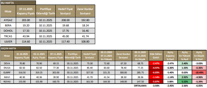 3 Kasım – 7 Kasım 2025 haftasında model portföyde yer alan DEVA, ENJSA, GUBRF, MAVI ve RGYAS haftayı negatif getiriyle tamamladı. GUBRF haftayı %6.03 düşüşle tamamlayarak portföyde haftanın en zayıf performansını sergiledi. Bu dönemde BIST 100 endeksi %0.43 oranında değer kaybederken, model portföyde yer alan hisseler ortalama %3.93 oranında değer yitirmiştir. 10 Kasım – 14 Kasım haftasında geçerli model portföyümüzde ise AYGAZ, BERA, DOHOL, TRCAS ve ULKER hisselerine yer veriyoruz.