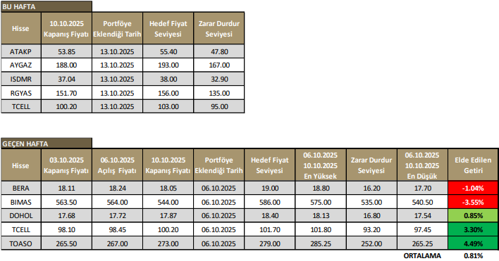 6 Ekim – 10 Ekim 2025 haftasında model portföyde yer alan BERA ve BIMAS hisseleri haftayı negatif getiriyle tamamlarken, DOHOL, TCELL ve TOASO hisseleri haftayı pozitif getiriyle kapattı.