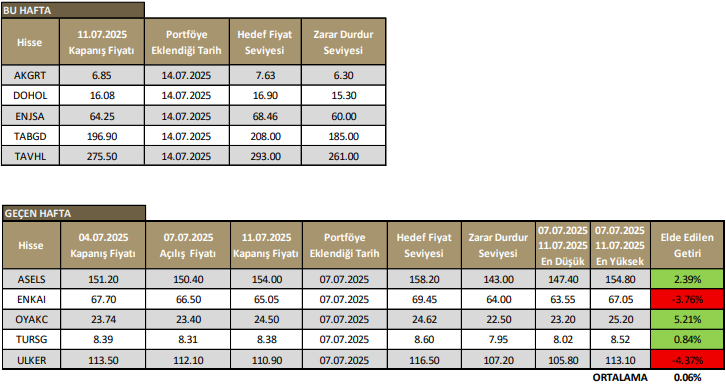 07 – 11 Temmuz haftası model portföyümüzde yer alan ASELS, ENKAI, OYAKC, TURSG ve ULKER hisselerinden yalnızca OYAKC hedef fiyat seviyesine ulaşmıştır. Aynı dönemde ENKAI ve ULKER hisseleri zarar durdur seviyelerine gerilemiştir.