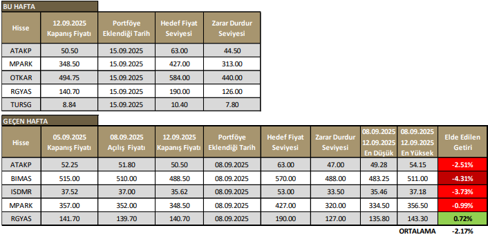 8 – 12 Eylül 2025 haftasında model portföyde yer alan ATAKP, BIMAS, ISDMR ve MPARK hisseleri haftayı negatif getiriyle tamamladı.