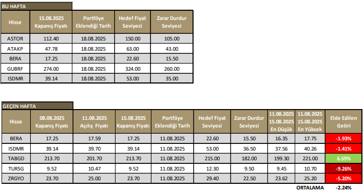 11 Ağustos – 15 Ağustos haftasında model portföyde yer alan hisselerden BERA, ISDMR, TURSG ve ZRGYO haftayı negatif getiriyle tamamlamıştır. Hafta içerisinde model portföy içerisinde yer alan hisselerden TABGD hedef fiyat seviyesine ulaşmıştır.