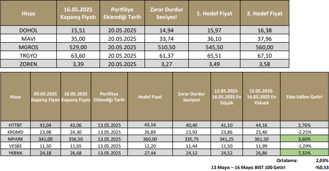 20 – 23 Mayıs haftası geçerli olan model portföyümüze DOHOL, MAVI (*), MGROS, TRGYO ve ZOREN hisselerini ekliyoruz. (MAVI katılım endeksine uygundur.)