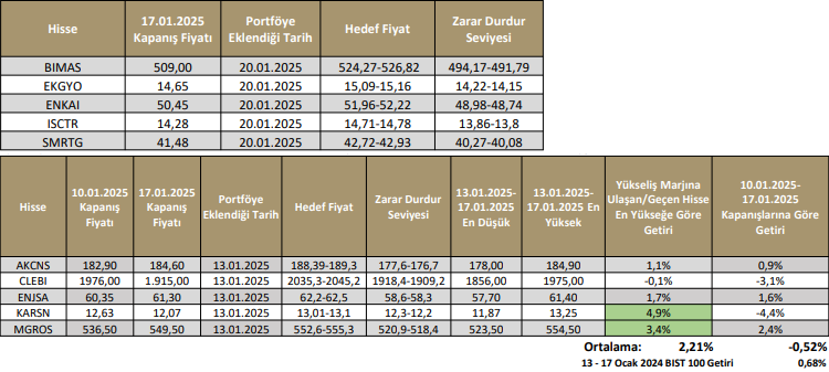 13 – 17 Ocak aralığında geçerli model portföyümüzde yer alan pay senetlerinden KARSN ve MGROS hedef fiyat seviyesine ulaşmıştır. Bu tarih aralığı içinde gördüğü en yüksek kapanış değerine göre, en yüksek getiriyi sağlayan pay senedi 4,9% yükseliş yaşayan KARSN olmuştur.