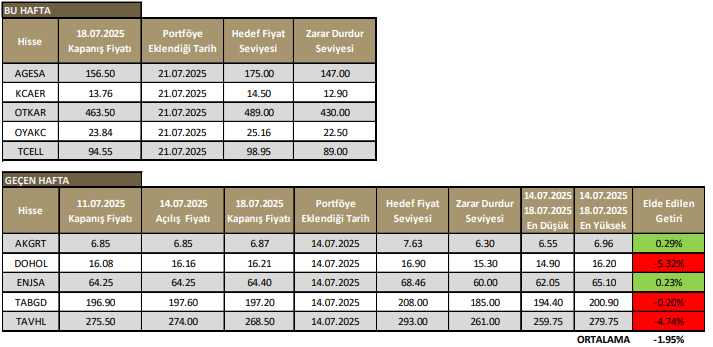 14 – 18 Temmuz haftasında model portföyde yer alan hisselerden AKGRT ve ENJSA haftayı sınırlı pozitif getiriyle tamamladı. Aynı dönemde DOHOL ve TAVHL hisseleri zarar durdur seviyelerine gerilemiştir.