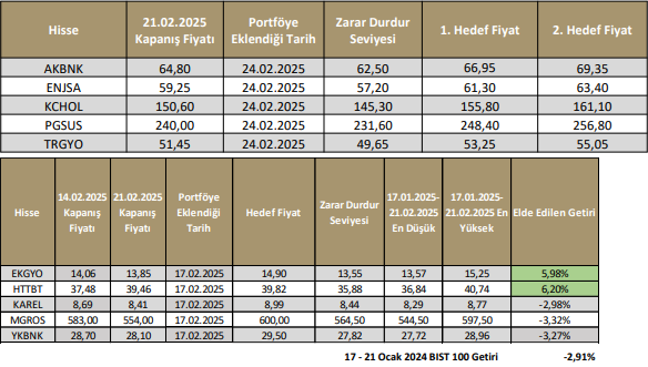 17 – 21 Şubat tarihleri aralığında geçerli model portföyümüzde yer alan pay senetlerinden EKGYO ve HTTBT hedef fiyatına ulaşmıştır. 17 – 21 Şubat haftası aralığında XU100 endeksi 2,91% değer kaybederken model portföyün aynı periyottaki değer kazancı ortalama 0,52% olmuştur.