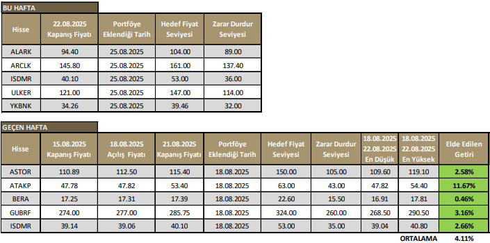 18 Ağustos – 22 Ağustos haftasında model portföyde yer alan hisselerden ASTOR, ATAKP, BERA, GUBRF ve ISDMR haftayı pozitif getiriyle tamamlamıştır. ATAKP hissesi haftayı %11.67 yükselişle kapatarak portföy performansına güçlü katkı verirken, BERA hissesi haftayı daha sınırlı bir getiriyle tamamladı.