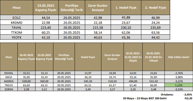 20 – 23 Mayıs tarihleri aralığında geçerli model portföyümüzde yer alan pay senetlerinden TRGYO hedef fiyatına ulaşmıştır. 20 – 23 mayıs haftası aralığında BIST100 endeksi -%3,20 değer kaybederken model portföyün aynı periyottaki değer kaybı ortalama -%2,45 olmuştur.