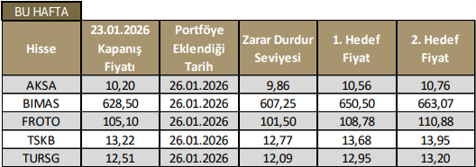 19 Ocak – 23 Ocak 2026 haftasında model portföyde yer alan hisselerimizin tamamı haftayı pozitif getiriyle tamamladı. Bu dönemde Bist-100 endeksi %2,56 değer kazanırken, model portföyün aynı periyottaki getirisi %3,05 olmuştur. 26 Ocak – 30 Ocak haftasında geçerli model portföyümüzde ise AKSA, BIMAS, FROTO, TSKB ve TURSG hisselerine yer veriyoruz.