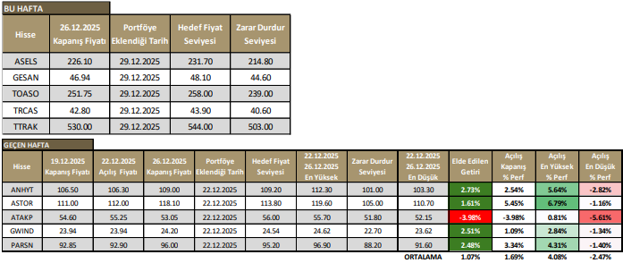 22-26 Aralık 2025 haftasında model portföydeki ANHYT, ASTOR, GWIND ve PARSN pozitif kapanış gerçekleştirdi Hafta içerisinde ANHYT, ASTOR, ATAKP ve PARSN hedef fiyatına ulaşırken; ATAKP, %3.98 düşüşle portföyün en zayıf performansını kaydetti. Bu dönemde BIST 100 endeksi %0.42 oranında değer kaybederken, model portföyün aynı periyottaki ortalama kazancı %1.07 oldu. 29 Aralık 2025 – 2 Ocak 2026 haftasında geçerli model portföyümüzde ise ASELS, GESAN, TOASO , TRCAS ve TTRAK hisselerine yer veriyoruz.