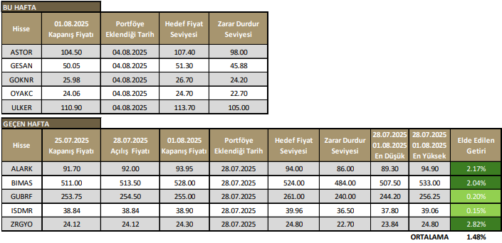 28 Temmuz – 1 Ağustos haftasında model portföyde yer alan hisselerden ALARK, BIMAS, GUBRF, ISDMR ve ZRGYO haftayı pozitif getiriyle tamamlamıştır. Hafta içerisinde ALARK, BIMAS ve ZRGYO hisseleri belirlenen hedef fiyat seviyelerine ulaşmıştır.