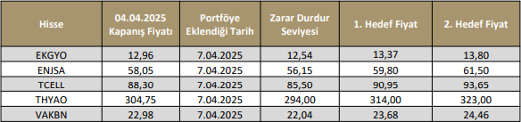 Geçtiğimiz 2 hafta boyunca Borsa İstanbul’da yaşanan yüksek volatilite kapsamında haftalık model portföy paylaşımı yapılmamıştır. 7-11 Nisan haftası aralığında yeni güne başlarken haftalık model portföyümüze EKGYO, ENJSA (*), TCELL, THYAO ve VAKBN hisselerini ekliyoruz. (ENJSA katılım endeksine tabidir.)