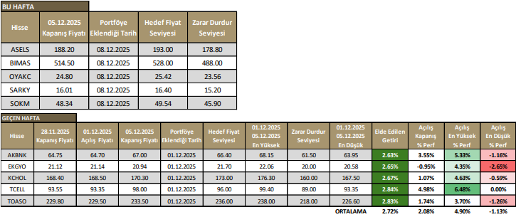 1 Aralık – 5 Aralık 2025 haftasında model portföyde yer alan AKBNK, EKGYO, KCHOL, TCELL ve TOASO haftayı pozitif getiriyle tamamladı. Hafta içerisinde portföyde yer alan hisselerin tamamı belirlenen hedef fiyat seviyelerine ulaştı.
