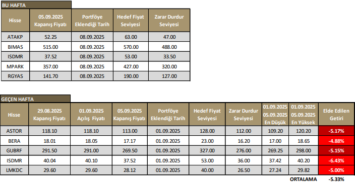 1 – 5 Eylül 2025 haftasında model portföyde yer alan ASTOR, BERA, GUBRF, ISDMR ve LMKDC hisseleri haftayı negatif getiriyle tamamlamıştır.