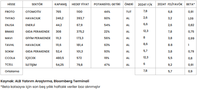 Diğer yandan BİM yine istikrar ve mevcut konjonktürde defansif duruş tarafında dikkat çeken hisselerden biri olmayı sürdürürken, talep esnekliği düşük ve yüksek maliyet kontrolü ile kar marjlarını koruyabilen Mavi Giyim şirketi için de 2024’de diğer sektörlerden pozitif ayrışma yaşanabileceğini düşünüyoruz. Toplam dokuz şirketin bulunduğu 12 aylık model portföyün 2024 tahmini 12 aylık karları üzerinden ortalama 2024T F/K oranı 7.8x, 2024T FD/FAVÖK oranı ise 5.7x ile görece düşük seviyelerde bulunuyor. Yüksek faiz ortamına karşın model portföydeki şirketlerin cazip değerlemeleri ve düşük ileri dönük çarpanlarının model portföyün en azından 2024 ilk çeyreği boyunca daha ön planda olmasını beklediğimiz defansif stratejiye uygun bir konumlanma sağladığını düşünüyoruz.