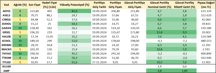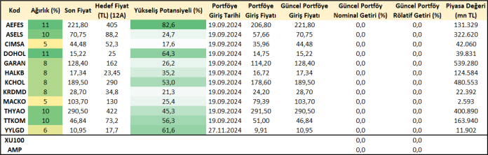 Getiri hesabında şirketlerin portföye giriş fiyatları değil, son güncelleme tarihindeki (27.11.24) fiyatları baz alınmıştır. Ayrıca güncel portföy nominal/rölatif getirisi de ağırlıklandırmalardaki değişiklikler hesaba katılarak dönemsel hesap edilmiştir.