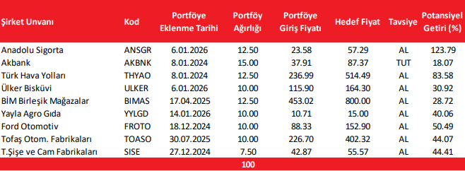 8 Ocak 2024 tarihinde model portföyümüzde dahil ettiğimiz Mavi Giyim(MAVI)’i, yüzde 74,96 oranında nominal ve yüzde 10,59 oranında rölatif getiri performanslarıyla(dünkü kapanış fiyatı ile) model portföyümüzden çıkartıp; yerine Yayla Agro Gıda(YYLGD)’yı dünkü kapanış fiyatı ile eklemiş bulunmaktayız. YYLGD’nın portföyümüzdeki ağırlığı yüzde 10,0 olup, hedef fiyatımız 15,00 TL’dir.
