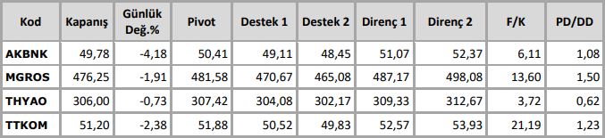 BİST100 endeksi dünkü işlemlerde 9275- 9472 bandında hareket ederek günü %2,13 değer kaybı ile 9275,50 puandan tamamladı. İşlem hacmi 97,6 milyar TL olarak gerçekleşti. Sınai endeksi dünkü işlemlerde %1,97, bankacılık endeksi %3,82 değer kaybı ile günü tamamladı. Dünkü işlemlerde puan bazlı en çok katkıyı ENKAI, GRTHO, PASEU sağlarken AKBNK, ISCTR, SAHOL endeksi baskılayan tarafta yer aldı. Bankacılık endeksinde gözlenen zayıf seyir ile dünkü işlemlerde 12000 eşiği aşağı yönde test edildi. Önemli bir destek olarak izlediğimiz 12000’in altında satışların derinleşmesi halinde yılın en düşük seviyesi 11900 yakınlarından destek bulunması beklenebilir. Bu seviyenin altında ise 11850 ve 11700 desteklerine geri çekilmeler gözlenebilir. Yeniden 12000 ve üzerinde tutunmalar halinde ise 12150 ve 12300 dirençleri takip edilebilir. XBANK’ta 200 günlük AO ile 50 günlük AO’nın aralığının daralması (14295-14230), olası bir Death Cross formasyonuna işaret ederek teknik açıdan olumsuz değerlendirilebilir.