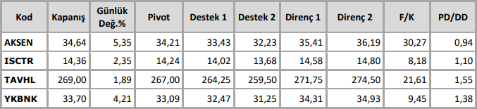 BİST100 endeksi dünkü işlemlerde 9986-10171 bandında hareket etti. Endeks gün sonunda %1,69 oranında değer kazanarak 10167 puandan kapattı. İşlem hacmi 105 milyar TL olarak gerçekleşti. Endekse en çok katkıyı TUPRS, YKBNK, AKBNK sağlarken, ASELS, PASEU, KOZAL baskılayan tarafta yer aldı. Sınai endeksi %1,41, bankacılık endeksi %2,56 değer kazandı. Bankacılık endeksinde son bir haftalık işlemlerde destek olarak çalışan 15500’den gelen alımlarla kısa vadeli yön dün yukarı döndü . XBANK’ta dün gelen alımların etkisi ile en yüksek 15989 puan test edildi. Gün sonunda kapanışın 5 günlük AO’sı 15781 puan üzerinde olması kısa vadeli teknik yön için olumlu. Bu seviye üzerinde kalınması halinde 16000 ve 16315 dirençleri test edilebilir. XBANK’ta 50 günlük AO 13757 puan ile 200 günlük AO 13687 puan üzerine yükseldi ve orta vadeli yön açısından olumlu bir görüntü oluşmuştur.