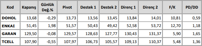BİST100 endeksi dünkü işlemlerde 9756-9904 bandında hareket ederek günü %1,04 değer kaybı ile 9779,57 puandan tamamladı. İşlem hacmi 102 milyar TL olarak gerçekleşti. Dünkü işlemlerde sınai endeksi %1,14, bankacılık endeksi %0,91 değer kaybetti. Endekse puan bazlı en çok katkıyı SAHOL, KOZAL, AEFES sağlarken ASELS, BIMAS, THYAO endeksi baskılayan tarafta yer aldı. Kısa vadeli yönde izlediğimiz 14450-14300 bölgesi yakınlarında dengelenmelerin takip edildiği bankacılık endeksinde bu seviye üzerine yerleşmeler ile kısa vadeli yükselen hareketin 14750 ve 15000 dirençlerine kadar devam etmesi beklenebilir. Bu seviye altına olası geri çekilmelerde ise 14000 desteği takip edilebilir.