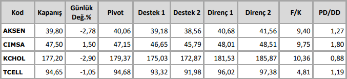 BİST 100 endeksinde dünkü işlemlerde 50 günlük AO’nın bulunduğu 9845’in altında artan satış baskısı ile orta vadeli önemli destek olarak izlediğimiz 200 günlük AO(9770) aşağı yönlü test edildi. Geri çekilmelerin 9700 desteği yakınlarından karşılandığı endekste, tepki alımlarının 9770’in üzerinde hız kazanması beklenebilir. Olası geri çekilmelerde ise son altı haftalık alçalan kanal alt bandının bulunduğu 9700 ve altında 9590 (100 günlük AO) ile önceki haftalarda takip edilen dip seviyesi 9560 takip edilebilir. Endekste yukarı yönlü hareketler halinde, 9770 (200 günlük AO) ilk hedef olup, bu seviye ve üzerinde yerleşmeler ile 9850 ardından 9900-9950 bölgesinin hedefe girmesi beklenebilir. Endekste teknik görünümde iyileşmeler için ise psikolojik eşik olarak izlediğimiz 10000 ve üzerinde kapanışlar alınması önem arz etmektedir. Öte yandan geçtiğimiz 50 günlük AO’nın (9845), 200 günlük AO’yı (9770) yukarı yönlü geçmesi ile gözlenen Golden Cross formasyonunun onay kazanması halinde endekste trend dönüşümü desteklenerek yukarı yönde hareket hız kazanabilir. Orta vadeli teknik göstergelerden MACD haftalık bazda sıfır çizgisi üzerinde ve “AL” konumundadır. Kısa vadeli teknik göstergelerden RSI’da negatif yönelim izlenmektedir. Endekste dünkü işlemler dolar bazlı 2,73-2,79 cent bandında kapanış 2,74 centten gerçekleşti. Yukarı yönde 2,80 cent ve üzerinde tutunmalar ile yükselen hareketin hız kazanması beklenebilir. Olası geri çekilmelerde ise 2,70cent destek olarak takip edilebilir.