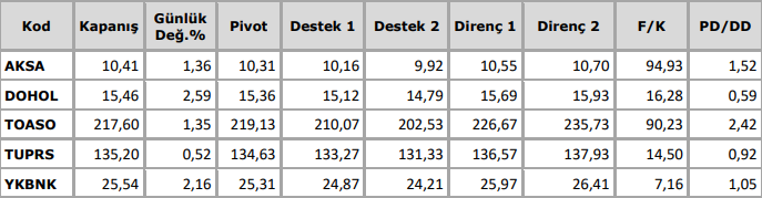 BİST100 endeksinde orta vadeli önemli ortalamaların geçilmesi ile başlayan yükselişin etkisi devam etmektedir. Orta vadeli yönde önemli bir seviye olarak izlediğimiz 200 günlük AO’sının karşılık geldiği 9670’in yukarısında yerleşmeler, teknik görünümde iyileşmeler için önem arz etmektedir. Endekste, son iki aylık alçalan hareketin kırılması için ilk etapta 9800 -9900 direnç bölgesinin geçilmesi gerekiyor. Bu bölge üzerinde ise 10000 direncinin hedeflenmesi beklenebilir. Olası düzeltme hareketlerinde ise 9670-9600 ilk destekler olup; aşağı yönde geçilmesi halinde 9500 ve 9400 destekleri kademeli olarak izlenebilir. Geri çekilmelerin kar satışı olarak değerlendirilebilmesi için ise 5 günlük AO’nın bulunduğu 9560’ın üzerinde kapanışların alınması gerekmekte. Orta vadeli teknik gösterge MACD’de haftalık bazda sıfır çizgisinde ve SAT konumunda bulunmaktadır. Kısa vadeli teknik göstergelerinden RSI’da ise dünkü geri çekilmeler ile hafif negatif bir yönelim izlenmektedir. Dünkü işlemlerde dolar bazlı 2,48- 2,51 cent bandında hareket eden endekste, kapanış 2,50 centten gerçekleşti. Kritik eşik olarak izlediğimiz 2,50cent üzerinde kapanışların devam etmesi ile yükselen hareketin orta vadeli yönde izlediğimiz dolar bazlı 200 günlük AO’nın bulunduğu 2,66cent hedefe girebilir. Olası geri çekilmelerde kısa vadeli destek olarak 2,45-2,40cent bölgesi takip edilebilir.