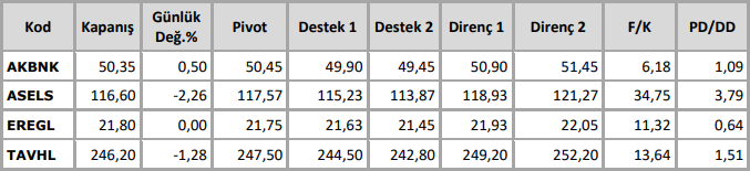 BİST100 endeksi dünkü işlemlerde 9383-9492 bandında hareket ederek günü %0,32 değer kaybı ile 9393,79 puandan tamamladı. İşlem hacmi 89,1 milyar TL olarak gerçekleşti. Sınai endeksi dünkü işlemlerde %0,35, bankacılık endeksi %0,19 değer kaybetti. Endekse puan bazlı en çok katkıyı THYAO, SASA, RALYH sağlarken ASELS, FROTO, KCHOL endeksi baskılayan tarafta yer aldı. Bu haftaki işlemlerde kısa vadeli ortalaması 5 günlük AO’nın bulunduğu 12015 yakınlarında dengelenme çabasının takip edildiği bankacılık endeksinde, dünkü işlemlerde işlemler dar bir bant aralığında gerçekleşti. XBANK’ta, 12000 seviyesinin üzerinde tutunmaların devam etmesi halinde, yukarı yönde 12150-12300 direnç bölgesi ilk etapta izlenecek olup, bu bölgenin yukarı yönde geçilmesi halinde 13000 direnci orta vadeli direnç olarak izlenebilir. 12000 eşiğinin aşağı yönde geçilmesi halinde zayıf görünümün 11850 ve 11800 desteklerine kadar devam etmesi beklenebilir. Death Cross formasyonunun izlendiği bankacılık endeksinde, 200 günlük AO’nın (14143); 50 günlük AO’yı (13900) yukarısında kapanışların devam etmesi halinde, formasyonun onay alarak teknik görümümde bozulmaların izlenmesi beklenebilir. Bu hafta TCMB PPK faiz kararı takip edilecek olup, kararı takiben bankacılık endeksinde volatilite yüksek seyredebilir.