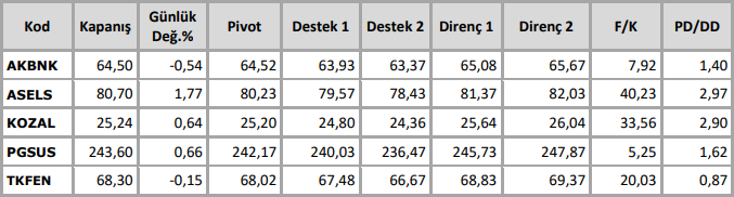 BİST100 endeksi dünkü işlemlerde 9836-9899 bandında hareket etti. Günü %0,42 değer kaybı ve 9836,49 puan ile günün en düşük seviyesinden kapattı. İşlem hacmi 79,2 milyar TL olarak gerçekleşti. Sınai endeksi günü %0,37, bankacılık endeksi %0,25 değer kaybı ile tamamladı. Endekse puan bazlı en çok katkıyı THYAO, ASELS, EREGL sağlarken TCELL, BIMAS, TAVHL endeksi baskılayan tarafta yer aldı. Kısa vadeli ortalamalarının arasında sıkışık seyrin takip edildiği bankacılık endeksinde 14750 yukarı yönde test edilse de bu bölgeden gelen satış baskısı takip edildi. 14750 üzerinde kapanışların alınması halinde kritik eşik olarak 15000 ve 15205 dirençleri takip edilebilir. Bu bölge üzerine yerleşmeler ile kısa vadeli yükselen hareketin onay kazanması beklenebilir. XBANK’ta olası geri çekilmelerde ise 14500 kısa vadeli destek bölgesi olup, bu seviye altında orta vadeli yönde izlediğimiz 14375 takip edilebilir. Bu seviyenin aşağı yönde geçilmesi halinde satışlarda artış gözlenebilir.