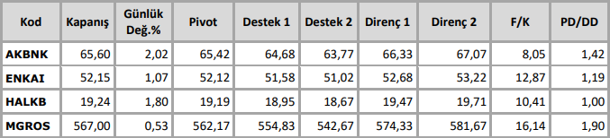 BİST100 endeksi dünkü işlemlerde 9754- 9853 bandında hareketle günü %0,45 değer kazancı ile 9807,50 puandan tamamladı. İşlem hacmi 106,0 milyar TL olarak gerçekleşti. Sınai endeksi günü %0,63, bankacılık endeksi %2,02 değer kazancı ile tamamladı. Endekse puan bazlı en çok katkıyı ISCTR, AKBNK, TCELL sağlarken BIMAS, THYAO, ASTOR endeksi baskılayan tarafta yer aldı. Dünkü işlemlerde kısa vadeli yükselen hareketin takip edildiği bankacılık endeksinde, 22 günlük AO’nın bulunduğu 14835 yukarısında yükseliş hız kazandı. 15000’in önemli bir direnç olarak takip edildiği XBANK’ta bu seviye üzerinde kısa vadeli yükselen hareketin güç kazanması beklenebilir. Yukarı yönde 15250 ve 15500 dirençleri takip edilebilir. Olası geri çekilmelerde ise 14700 ve 14500 destek bölgesi olarak izlenebilir.