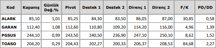 BİST100 endeksi dünkü işlemlerde 9353-9521 bandında hareket ettikten sonra günü %0,81 değer kazancıyla 9475 puandan tamamladı. İşlem hacmi 104 milyar TL olarak gerçekleşti. Sınai endeksi %0,05, bankacılık endeksi %1,42 değer kazandı. Endekse puan bazlı en çok katkıyı ASELS, BIMAS, AKBNK sağlarken ENKAI, EREGL, EKGYO endeksi baskılayan tarafta yer aldı. Güne negatif görüntü ile başlayan Bankacılık endeksi (XBANK) dünkü işlemlerde 12570-12844 bandında hareket ettikten sonra dünkü işlemleri 12687 puandan kapattı. Gün içinde artan alımlarla ilk etapta geçtiğimiz haftanın tepe noktası 12612 puan ve bu haftanın en yükseği 12759 puan geçildi. XBANK’ta, 12500 üzerinde kalma çabasının başarılı olması halinde 13000 ve 13500 dirençlerinin test edilmesini beklemekteyiz. XBANK endeksinde olası satışlarda 12500 ilk destek olmak üzere 50 günlük AO’sı 12250 ve 12000 destekleri oluşturmaktadır. Orta vadeli teknik yükselişin başlaması için ise 13000 üzerine yerleşme olması ve 200 günlük AO direnci 13700’ün geçilmesi önem arz etmektedir.