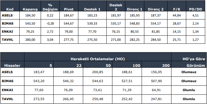 BIST100 endeksi dünkü işlemlerde en yüksek 11032 puan test edildi. Gün genelinde ise 10950 yakınlarında sıkışık seyir izleyen endeks, kapanışta 11000 altında yer buldu. Endeks son beş işlem gününde gözlenen orta vadeli alçalan kanal üst bandı üzerinde harekete başladı. Endekste 5 günlük ağırlıklı ortalama 10910 üzerinde kalınması kısa vadeli yön açısından önemli. Bundan sonraki aşamada 11000, 11300 ve 11500 dirençlerinin geçilmesi yükselişin onay alması için hedef dirençler olabilir. 22 günlük ağırlıklı ortalama 10839 ve 50 günlük ağırlıklı ortalama 10800 puanlara yükseldi. BIST100 endeksinde aşağı yönde 10900, 10800, 10700 ve 10500 (200 günlük ağırlıklı ortalama) destekleri oluşturmaktadır
