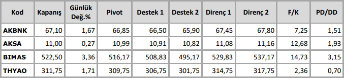 BİST100 endeksi dünkü işlemlerde 9977-10139 bandında hareket ederek günü %1,24 değer kazancı ile 10121,77 puandan tamamladı. İşlem hacmi 109,7 milyar TL olarak gerçekleşti. Endeksten negatif ayrışan sınai endeksi günü %0,08 değer kaybı ile tamamlarken, bankacılık endeksi %1,73 değer kazandı. Dünkü işlemlerde puan bazlı en çok katkıyı BIMAS, ASELS, THYAO sağlarken ENKAI, OYAKC, KCHOL endeksi baskılayan tarafta yer aldı. Dünkü işlemlerde kısa vadeli yönde izlediğimiz 5 günlük AO’nın bulunduğu 15450 yakınlarında dengelenmelerin takip edildiği bankacılık endeksinde, bu seviye üzerine yerleşmeler ile yukarı yönlü hareket desteklenebilir. Yukarıda 15650 ve 15800 dirençleri ilk aşamada izlenecek olup, bu bölgenin yukarı yönlü geçilmesi halinde 16000’e kadar yükselen hareketin devam etmesi beklenebilir. Olası geri çekilmelerde ise 22 günlük AO’nın bulunduğu 15185 ve 15000 destekleri takip edilebilir.