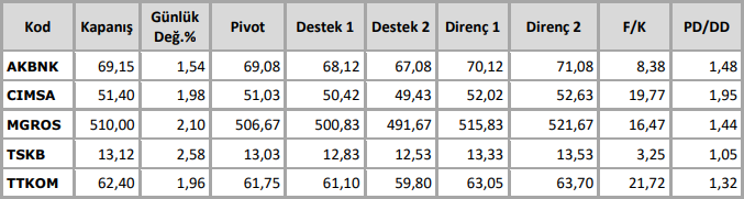 BİST100 endeksi dünkü işlemlerde 10103-10307 bandında hareket etti. Endeks gün sonunda %1,08 oranında değer kazanarak 10189 puandan kapattı. İşlem hacmi 147 milyar TL olarak gerçekleşti. Endekse en çok katkıyı BIMAS, EREGL, TUPRS sağlarken, ASELS, ENKAI, DSTKF baskılayan tarafta yer aldı. Sınai endeksi %0,97, bankacılık endeksi %1,51 değer kazandı. Bankacılık endeksinde (XBANK) 14500 (200 günlük AO) direncinin geçilmesi ile başlayan pozitif görüntünün etkisi dünkü işlemlerde 15959 puana kadar devam etti. XBANK’ta gün sonunda 15300 puana yaklaşan 5 günlük AO’nın kısa yükselen trendin devamı için önemli hale geldi. 15500 ara destek olmak üzere 15300 üzerinde kalınması durumunda, XBANK’ta 16000 -16250 dirençleri geçilebilir. Olası satışlarda 15000 altına geri çekilme olması halinde ise 14700-14500 kısa vadeli alım bölgesi olarak izlenebilir.