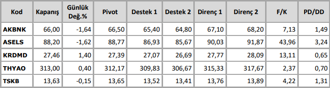 BİST100 endeksi dünkü işlemlerde 10076-10180 bandında hareket ederek günü %0,44 değer kaybı ile 10076,99 puandan günün en düşük seviyesinde tamamladı. İşlem hacmi 102,1 milyar TL olarak gerçekleşti. Sınai endeksi günü %1,19, bankacılık endeksi %1,12 değer kaybı ile tamamladı. Dünkü işlemlerde puan bazlı en çok katkıyı BIMAS, MGROS, THYAO sağlarken AKBNK, KCHOL, ASELS endeksi baskılayan tarafta yer aldı. 15500’ün üzerinde kalıcılık çabasının başarısız olduğu bankacılık endeksinde, kısa vadeli yön negatif seyretti. Aşağı yönlü hareketin devam etmesi halinde aşağıda 22 günlük AO’nın bulunduğu 15220 destek olarak izlenebilir. Bu seviyenin aşağısında ise satış baskısının 15000’e kadar devam etmesi beklenebilir. Yukarı yönde yeniden 5 günlük AO 15430 üzerinde fiyatlamalar ile yükselen hareketin 15650 ve 15850 dirençlerine kadar devam etmesi beklenebilir. Bu bölgenin üzerinde ise 16000 direnci hedeflenebilir.