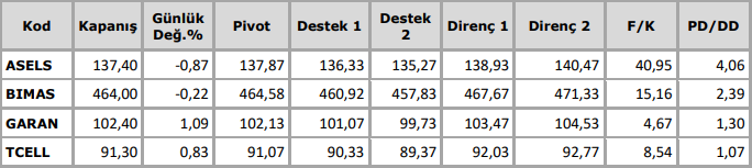 BİST100 endeksi dünkü işlemlerde 9216-9312 bandında hareket ederek günü %0,88 değer kaybı ile 9224,84 puandan tamamladı. İşlem hacmi 82,6 milyar TL olarak gerçekleşti. Sınai endeksi %0,43, bankacılık endeksi %0,27 değer kaybetti. Endekse puan bazlı en çok katkıyı TUPRS, TCELL, MIATK sağlarken THYAO, PGSUS, KCHOL endeksi baskılayan tarafta yer aldı. Satış baskısının devam ettiği bankacılık endeksinde, geri çekilmelerde kısa vadeli alçalan kanal alt bandının bulunduğu 11450 aşağı yönde test edildi. Bu bölgenin korunamaması halinde 11200 ve 11000 desteklerine geri çekilmeler gözlenebilir. 11000 altında ise geri çekilmelerin hız kazanması beklenebilir. Yönün yeniden pozitif seyretmesi için yukarı yönde 11450 üzerinde tutunmalar ilk etapta izlenecek olup yukarısında 11650-11825 bölgesi hedefe girebilir. Teknik görünümde iyileşmeler için bu bölge üzerinde tutunmalar önem arz etmektedir.