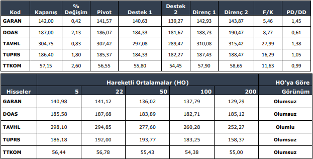 Teknik göstergelerden RSI ‘’57’’ seviyesinden ‘’48’’ seviyesine sert düşüş gösterdi. Bir diğer gösterge olan MACD ise eşik değer ‘’0’’ seviyesinin üzerinde hareketini sürdürmesine karşın düşüş çizgisi yükseliş çizgisinin üzerine geçti. Dünkü düşüş ile birlikte Momentum eşik değer olan 100 seviyesinin altında 98,2 gerileyerek güç kaybına işaret etti.