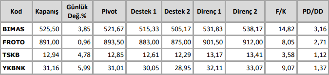 BİST100 endeksi dünkü işlemlerde 9748-10029 bandında hareket ederek günü %2,61 değer kazancı ile 9911,07 puandan tamamladı. İşlem hacmi 145,8 milyar TL olarak gerçekleşti. Sınai endeksi %0,47, yükselişe öncülük eden bankacılık endeksi %6,41 değer kazandı. Endekse puan bazlı en çok katkıyı AKBNK, BIMAS, YKBNK sağlarken OYAKC, ANSGR, AKSA endeksi baskılayan tarafta yer aldı. Haftaya beklentinin altında gelen enflasyon verileri sonrası hızlı bir yükselişle başlayan bankacılık endeksinde, tarihi zirve 16448’e taşındı. Bankacılık endeksinde 16500 ve üzerinde tutunmalar ile, 16750 ve 17000 dirençlerinde yeni rekor denemeleri izlenebilir. Olası düzeltme hareketlerinde ise 16000 eşiği ilk etapta izlenecek olup bu seviyenin altında satışların artarak kısa vadeli ortalamaların bulunduğu 15535 ve 15000 desteklerine kadar devam etmesi beklenebilir. Genel olarak son beş iş gününde takip edilen yükselen hareketin devam etmesi için 5 günlük AO’nın bulunduğu 15535 üzerinde kapanışların alınması gerekmekte.