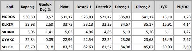 BİST100 endeksi dünkü işlemlerde 9972-10095 bandında hareket ederek günü %1,13 değer kaybı ile 9972,03 puandan günün en düşük seviyesi ile tamamladı. İşlem hacmi 94,5 milyar TL olarak gerçekleşti. Sınai endeksi günü %1,05 bankacılık endeksi %2,06 değer kaybı ile tamamladı. Dünkü işlemlerde endekse puan bazlı en çok katkıyı ASELS, TAVHL, TKFEN sağlarken; AKBNK, THYAO, YKBNK endeksi baskılayan tarafta yer aldı. Bankacılık endeksinde 15000 eşiğinin aşağı yönde test edilmesinin ardından hızlanan satışlar ile 14800 bölgesi yakınlarına kadar satış baskısı takip edildi. Kısa vadeli yönde izlediğimiz 5 günlük AO’nın bulunduğu 14960’ın yukarısında yenide kısa vadeli yön pozitif seyredebilir. Kritik eşik olarak izlediğimiz 15000 üzerindeki seviyeler ise, yükseliş eğiliminin devamı için önem arz etmektedir. Bu seviye üzerinde 15250-15500 direnç bölgesi izlenebilir. 15000 altında olası geri çekilmelerde ise 14600 ve 14500 destekleri takip edilebilir.