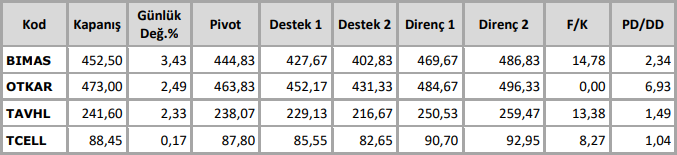 BİST100 endeksi dünkü işlemlerde 9050- 9506 bandında hareket ederek günü %0,29 değer kazancı ile 9407,17 puandan tamamladı. İşlem hacmi 131,9 milyar TL olarak gerçekleşti. Sınai endeksi negatif ayrışarak günü %0,51 değer kaybıyla , bankacılık endeksi ise %0,02 değer kazancı ile günü yatay yönde tamamladı. Dünkü işlemlerde puan bazlı en çok katkıyı BIMAS, THYAO, TKFEN sağlarken KCHOL, TUPRS, EREGL endeksi baskılayan tarafta yer aldı. Bankacılık endeksinde 12000 desteği aşağı yönde test edilmesinin ardından gelen alımlar ile yukarı yönde izlediğimiz 5 günlük AO’nın bulunduğu 12485’e kadar yükseliş takip edildi. Bu seviye üzerinde tutunmalar ile 12650 ve 12800 dirençleri izlenebilir. Olası geri çekilmelerde ise 12250-12000 bölgesi takip edilebilir.