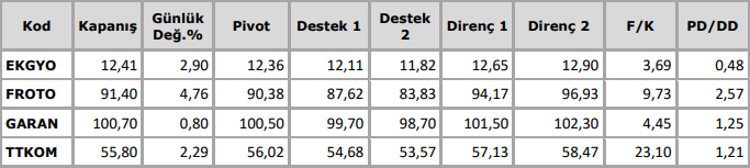 BİST100 endeksi dünkü işlemlerde 9093-9302 bandında hareket ederek günü %2,25 değer kazancı ile 9279,21 puandan tamamladı. İşlem hacmi 97,3 milyar TL olarak gerçekleşti. Sınai endeksi %2,52; bankacılık endeksi %1,30 oranlarında değer kazandı. Endekse puan bazlı en çok katkıyı ASELS, TUPRS, THYAO sağlarken BIMAS, TAVHL, IEYHO endeksi baskılayan tarafta yer aldı. Dünkü işlemlerde yükselişin 22 günlük AO’nın karşılık geldiği 11670’e kadar devam ettiği bankacılık endeksinde, yukarı yönlü hareketin 11850 direncine ardından bu seviye üzerine yerleşmeler halinde ise 12000 eşik direncine devam etmesi beklenebilir. Bu bölgenin üzerinde ise teknik görünümde iyileşmeler takip edilebilir.