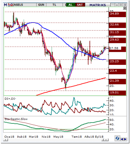 Son dönemde 50 periyotluk hareketli ortalaması üzerinde oluşturduğu konsolide bölgesini yukarı kıran hisse fiyatı 27,82 direncini test etmiştir.