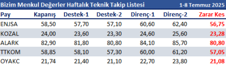 1-8 Temmuz 2025 dönemi için teknik takip listemizde ENJSA, KOZAL, ALARK, TTKOM ve OYAKC yer almaktadır.