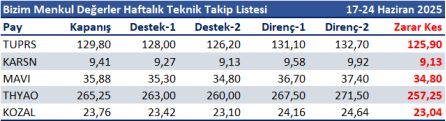 17-24 Haziran 2025 dönemi için teknik takip listemizde TUPRS, KARSN, MAVI, THYAO ve KOZAL yer almaktadır.