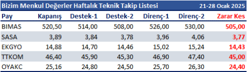 21-28 Ocak 2025 dönemi için teknik takip listemizde BIMAS, SASA, EKGYO, TTKOM ve OYAKC yer almaktadır.