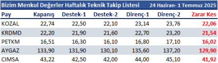 24 Haziran- 1 Temmuz 2025 dönemi için teknik takip listemizde KOZAL, KRDMD, PETKM, AYGAZ ve CIMSA yer almaktadır.