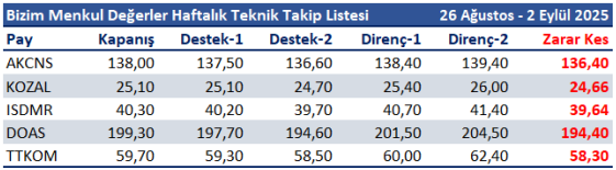 26 Ağustos – 2 Eylül 2025 dönemi için teknik takip listemizde AKCNS, KOZAL, ISDMR, DOAS ve TTKOM yer almaktadır.
